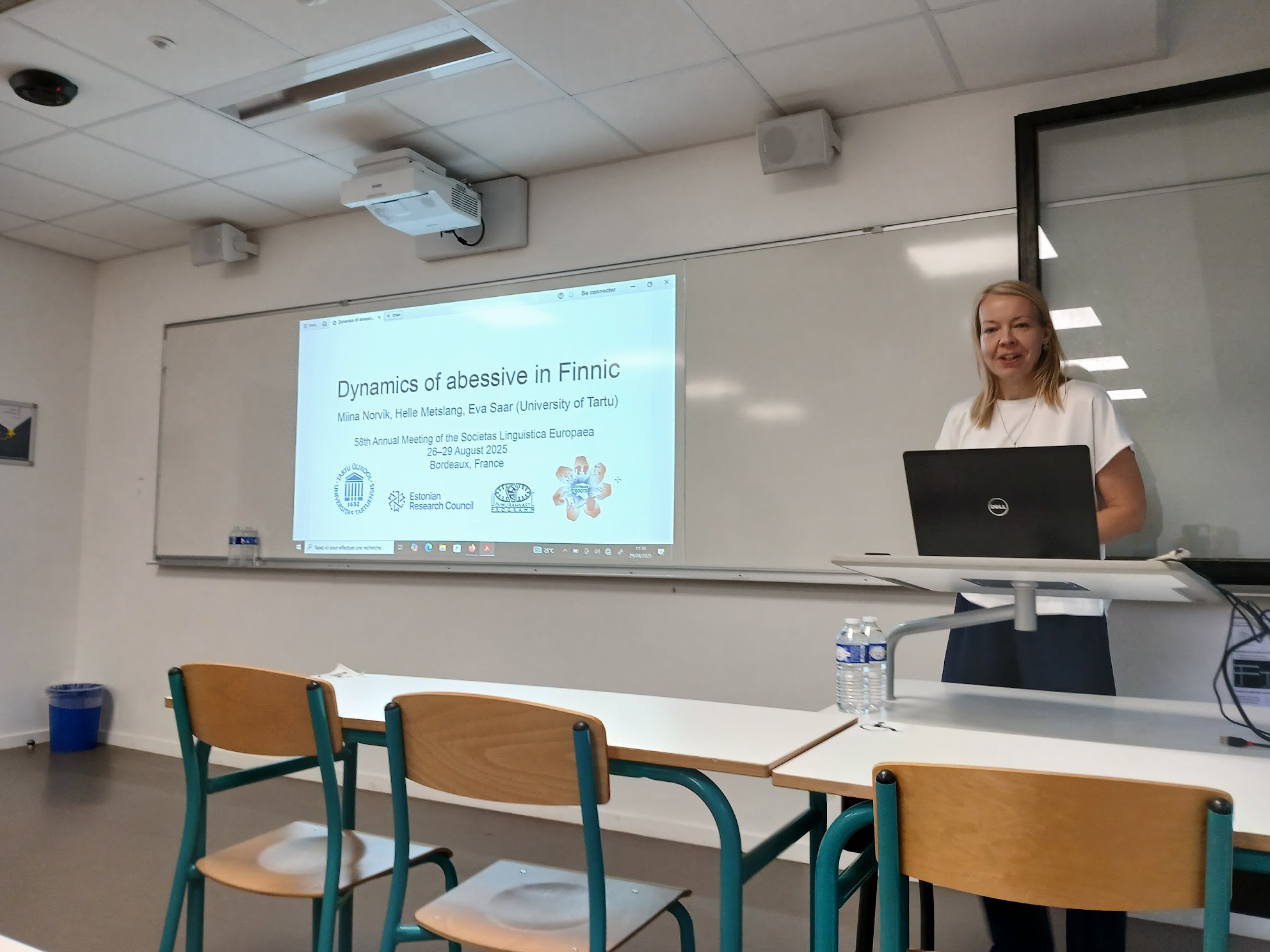Helle Metslang, Miina Norvik, Eva Saar, and Janek Vaab participated in the 58th Annual Meeting of the Societas Linguistica Europaea at the Université Bordeaux Montaigne. Project team members gave and/or were co-authors of the following presentations: “Dynamics of abessive in Livonian and Ingrian” (Miina Norvik, Helle Metslang, Eva Saar) (abstract), “Beyond evidentiality: epistemic authority and other effects on the use of grammatical evidentials in Southern Finnic” (Denys Teptiuk, Miina Norvik, Petar Kehayov), “Variation in the realisation of a glottal stop in Leivu South Estonian” (Janek Vaab). Janek Vaab won 2nd place for best research poster presentation at the Societas Linguisticae Europaea conference. (Photo 1: UT Institute of Estonian and General Linguistics facebook and instagram pages, Photo 2, 3: Helle Metslang)